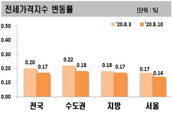 8월 2주차 아파트 전세가는 전주대비 0.17% 상승했다. 수도권의 상승폭은 0.18%로 지난주 0.22%에 비해 하락했으며 서울도 지난주 0.17%에서 이번주 0.14%로 내렸다.