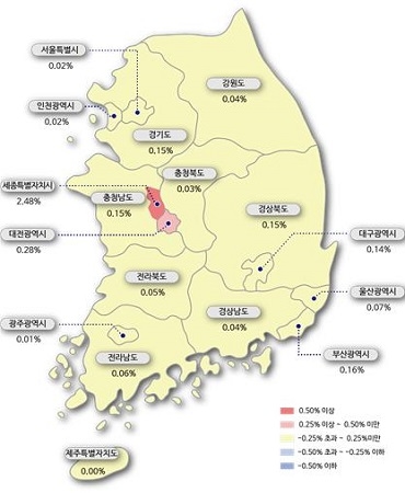 시도별로는 세종이 2.48% 오르며 가장 높은 상승세를 보였다. 이어 대전(0.28%), 부산(0.16%), 경기(0.15%) 등은 상승했으며 제주(0.00%)는 보합했다.