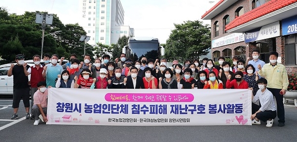 경남 창원시는 한국농업경영인회 창원시연합회와 한국여성농업인회 창원시연합회가 14일 제방붕괴로 극심한 침수피해를 입은 합천군 쌍책면 일원 농업인들을 돕기 위해 재난구호 봉사활동을 펼쳤다고 밝혔다.