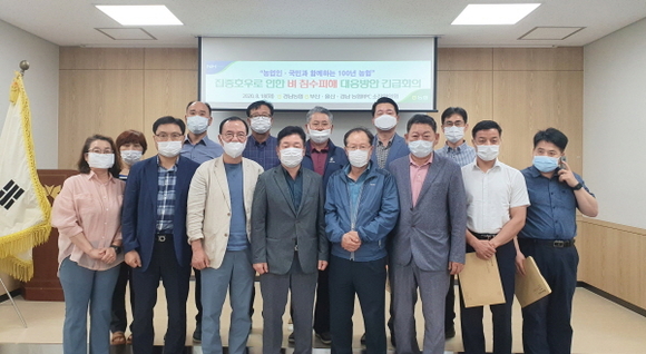 18일 열린 집중호우로 인한 벼(조생종) 침수피해 대응방안 긴급회의’에 참석한 RPC 대표들이 기념촬영을 하고 있다. (사진=경남농협 제공)