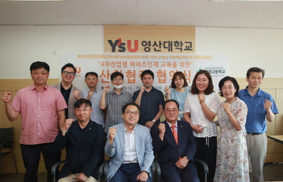 와이즈유(영산대학교) Art&Technology 대학(문화콘텐츠학부 가상현실콘텐츠전공, 미용예술학과)이 지난 14일 부산 대광고등학교와 ‘4차 산업형 마이스 인재교육을 위한 대학과 학교 간 협약식’을 진행했다.