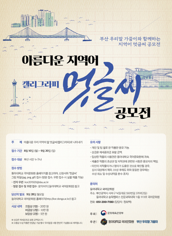 동아대학교 국어문화원은 부산 시민 누구나 참가할 수 있는 ‘아름다운 지역어 멋글씨 공모전’을 개최한다고 19일 밝혔다.