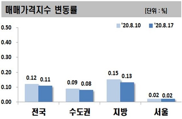 한국감정원이 올해 8월 셋째 주 전국 주간 아파트 가격 동향을 조사한 결과를 20일 발표했다. 이에 따르면 금주 아파트 매매가는 전주대비 0.11% 상승했으며 전세가는 0.17% 상승했다.