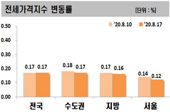 8월 3주차 아파트 전세가는 전주대비 0.17% 상승했다. 수도권의 상승폭은 0.17%로 지난주 0.18%에 비해 소폭 하락했으며 서울도 지난주 0.14%에서 이번주 0.12%로 내렸다.