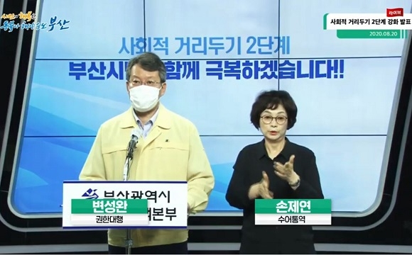 변성완 부산시장 권한대행은 20일 오후 3시 유튜브 등을 통해 비대면 온라인 기자회견을 열고 ‘부산시 사회적 거리두기 2단계 강화 조치’ 사항을 발표했다.