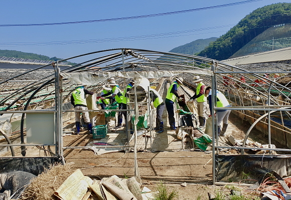 수해복구 봉사에 참여한 남부발전 임직원 20여명은 비닐하우스 내 수해로 인한 토사와 폐기물을 제거하는 활동을 전개했다.