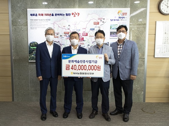밀양문화재단은 NH농협은행 밀양시지부와 경남은행 밀양지점에서 19일 지역문화예술진흥을 위한 지정기탁금을 전달해왔다고 밝혔다.