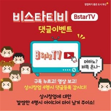 시와 경제진흥원은 채널 오픈을 기념해 내일(25일)부터 내달 24일까지 채널 오픈 기념 경품 이벤트를 진행한다. 이벤트 참여 방법은 ▲Bstar TV 구독 ▲이벤트 영상 댓글에 ‘상시창업’으로 4행시 작성 이 두 가지를 모두 수행하면 된다.