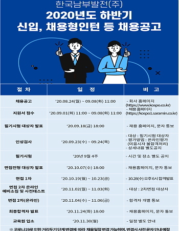 신입사원 지원서 접수와 채용에 대한 자세한 일정 확인은 남부발전 채용 홈페이지에서 살펴볼 수 있다. 다만 코로나19 확산 여파로 인해 불확실성이 커짐에 따라 채용일정은 조정될 수도 있다.