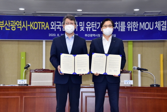 부산시와 대한무역투자진흥공사(KOTRA)가 26일 오전 11시 시청 26층 회의실에서 ‘외국인투자와 유턴기업 유치 활성화 업무협약’을 체결했다.