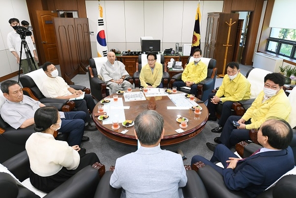 경남도의회 김하용 의장과 장규석‧이종호 부의장, 심상동 의회운영위원장은 25일 의장실에서 4대 종교단체 지도자와 긴급 간담회를 가지고 코로나19 지역감염 재확산에 따른 방안 등을 논의했다.