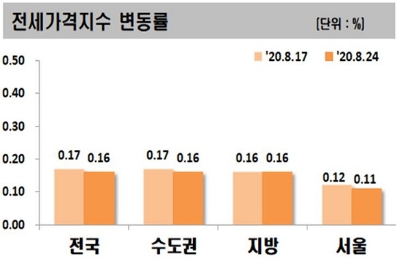 8월 4주차 아파트 전세가는 전주대비 0.16% 상승했다. 수도권의 상승폭은 0.16%로 지난주 0.17%에 비해 소폭 하락했으며 서울도 지난주 0.12%에서 이번주 0.11%로 소폭 내렸다.