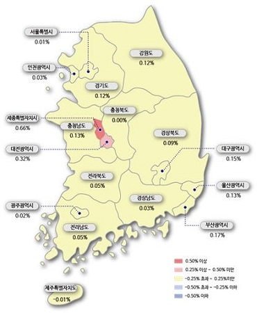 시도별로는 세종이 0.66% 오르며 가장 높은 상승세를 보였다. 이어 대전(0.32%), 부산(0.17%), 대구(0.15%) 등은 상승한 반면 제주(0.01%)는 하락했다.