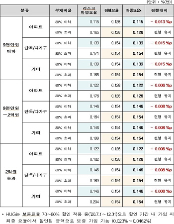 또 부채비율은 전세보증금과 선순위채권을 더한 금액이 주택가액의 80%보다 높은지 또는 낮은지를 기준으로 구분하게 된다. 특히 보증금 사고 위험이 낮을 경우 현재보다 낮은 보증료율을 적용하고 그 외에는 보증료 인상 없이 지금의 보증료율을 유지하도록 했다.
