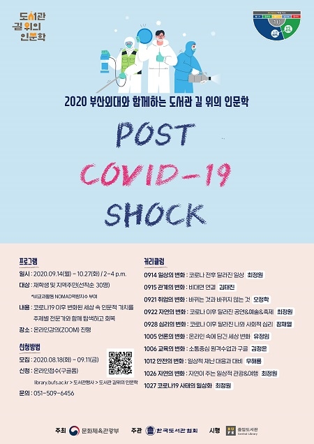중앙도서관은 'POST COVID-19 SHOCK: 일상의 변화와 대비'를 주제로 코로나19로 변화된 세상 속 인문학적 가치를 일상, 관계, 심리, 취업, 교육, 안전 등 관련 주제별 전문가와 함께 탐색하고 회복하는 시간을 가질 예정이다.