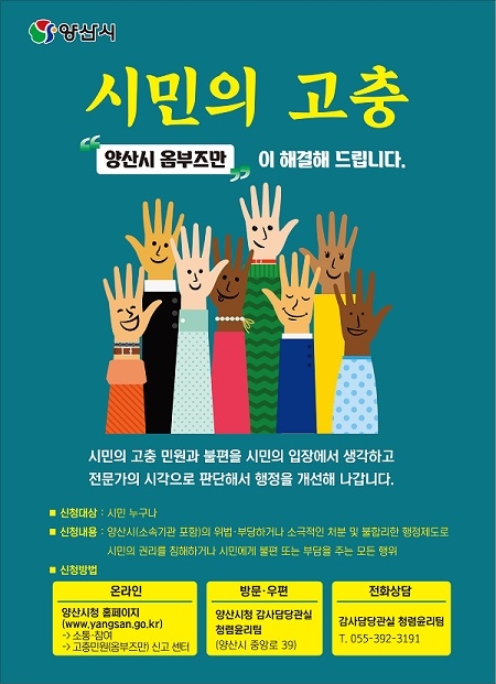 민원 신청방법은 양산시 홈페이지(소통·참여-고충민원 옴부즈만 신고센터), 직접 방문(양산시청 감사담당관실 청렴윤리팀), 우편, 팩스로 신청하면 된다.