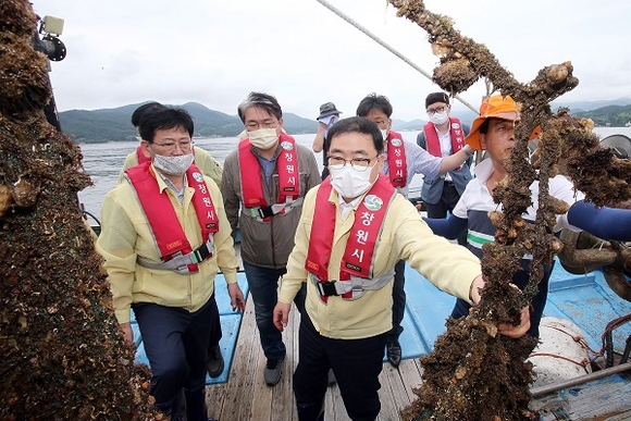 허성무 창원시장은 28일 김정호 국회의원(더불어민주당 경남도당 위원장), 이옥선 도의원 및 관계자들과 함께 마산합포구 심리해역과 진동만 해역에서 이상조류로 피해를 입은 현장을 방문했다.
