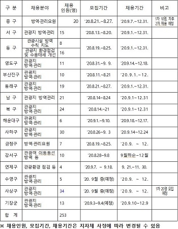 사업 참여자는 주요 관광지, 관문, 교통거점 등에 배치돼 관광지 방역, 관광수용태세 점검 등 업무를 맡게 된다. 채용은 공개채용을 원칙으로 각 구·군에서 자율적으로 하며 대상은 관광업 실직자, 휴직자 외에도 관광 분야 경력자, 관련학과 졸업자, 공공기관 근무 경력자 등도 지원할 수 있다.
