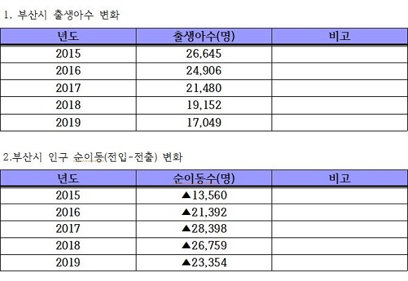 통계 자료를 살펴보면 부산시의 최근 5년간 순이동 인구 수(전입인구-전출인구)는 매년 전입인구에 비해 전출인구가 더 많은 것으로 집계되고 있다. 지난 2015년은 1만 3560명이 전입 수보다 더 많이 나갔으며 2016년은 2만 1392명, 2017년은 2만 8398명, 2018년은 2만 6759명, 지난해에는 2만 3354명인 것으로 나타났다.