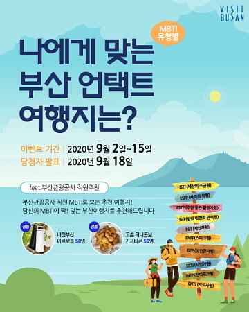 이번 이벤트는 새로운 소비자 그룹인 ‘Z세대(90년대 중반 이후 출생)’에서 유행하는 성격 유형 테스트인 MBTI를 접목해 부산의 언택트 여행지를 추천하는 것이다. MBTI는 자기 파악을 위한 테스트로만 끝나는 것이 아닌 사람 간 관계를 연결하는 수단으로도 쓰이고 있다.