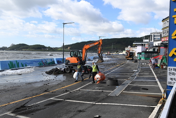 기장군은 오늘 오전 5시부터 전 부서 비상근무자들이 각 시설, 구역별로 태풍 피해 상황을 확인하고 도로 주변 적치물과 태풍 비산물 등을 제거하는 복구작업을 했다.