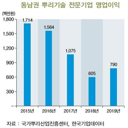 뿌리기술 전문기업의 업체당 평균 영업이익은 지난 2015년 17억 1000만원에 달했으나 지난해에는 7억 9000만원으로 절반 넘게 하락했다.