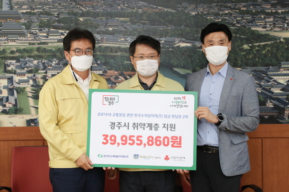 한국수력원자력(이하 한수원)이 3일 코로나19 피해 극복 지원을 위해 본사 임직원들이 반납한 임금 약 4000만원을 경주지역 취약계층을 위해 써달라며 경주시에 전달했다.
