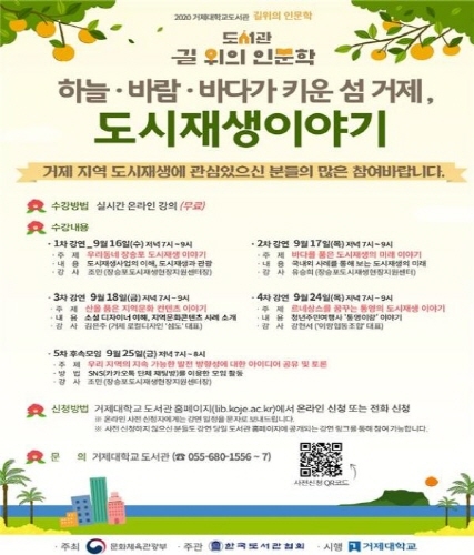 이번 강연은 코로나19의 재확산으로 인해 실시간 온라인 강연(무료)으로 진행되며, 참가 신청은 오는 15일까지 거제대 도서관 홈페이지 또는 전화로 할 수 있다.