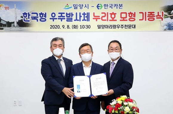 경남 밀양시와 (주)한국카본은 8일 밀양아리랑 우주천문대에서 한국형 발사체 '누리호' 모형 기증식을 가졌다.