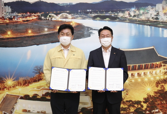 박윤옥 한국동서발전 기획본부장(오른쪽)과 박태완 울산광역시 중구청장이 공동체정원 협약 체결 후 기념촬영을 하고 있다. (사진=동서발전 제공)