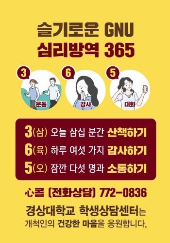 경상대 학생상담센터는 정신 건강에 필수적이면서도 일상에서 쉽게 실천할 수 있는 세 가지를 선정해 ‘슬기로운 GNU 심리방역 365’ 운동을 전개한다.
