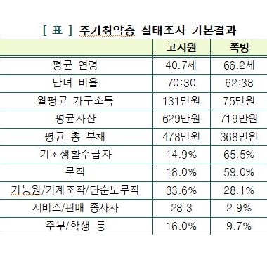 4가지 분류는 ▲고시원(비수급자) ▲쪽방(지방 비수급자) ▲쪽방(서울 수급자) ▲쪽방(수도권 수급자)이다. 조사 결과, 주거 취약계층 대부분은 주거 지원정책의 사각지대에 놓인 것으로 확인됐다.
