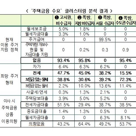 해당 연구는 주거 취약계층의 일반적 삶의 모습과 주택금융 수요를 조사한 뒤 각 클러스터별 금융지원 대상을 구체화하고 맞춤형 지원책을 내는 데 의의가 있다. 먼저 연구원은 실태조사 표본 2000개를 이용해 생활 거주 환경과 수급 여부 등에 따라 총 4개의 클러스터로 분류했다.