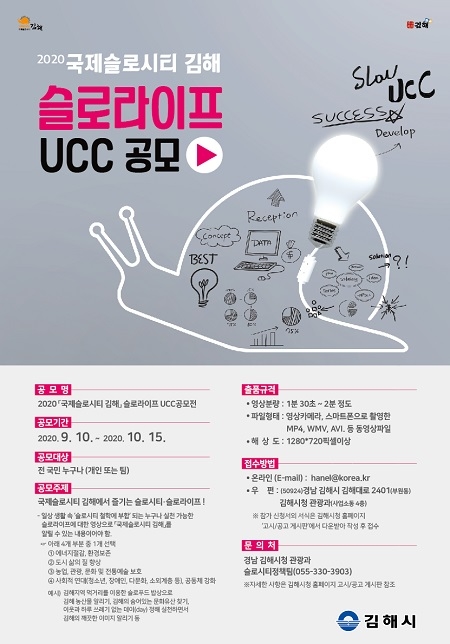 이번 슬로라이프 UCC 공모전은 '국제슬로시티 김해에서 즐기는 슬로시티·슬로라이프!'라는 주제로 전 국민 누구나 개인 또는 팀 자격으로 응모가 가능하다.