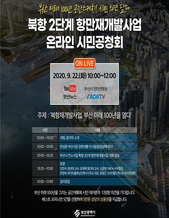 이번 시민 공청회는 ‘북항재개발 사업, 부산 미래 100년을 열다’란 주제로 시 공식 유튜브 채널 ‘붓싼뉴스’에서 비대면으로 열릴 예정이다. 공청회는 시민 참여자 사전 모집 없이 관심 있는 시민 누구나 당일 온라인으로 참여할 수 있다.