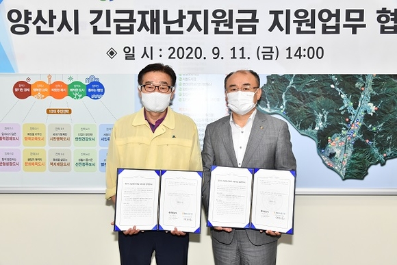 양산시는 신속한 민원응대와 정확한 업무처리를 위해 20명의 시 공무원으로 '긴급재난지원금 전담팀' 구성을 마쳤으며, 온누리상품권과 선불카드의 원활한 수급을 위해 9월 11일 NH농협은행 양산시지부와 업무협약 체결하는 등 양산시 긴급재난지원금 업무추진을 위해 준비에 박차를 가하고 있다.