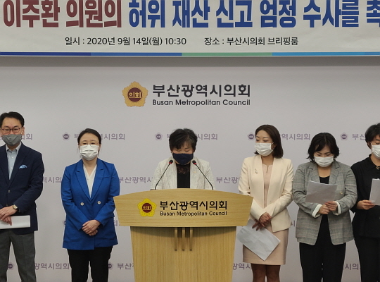더불어민주당 부산시당이 14일 오전 부산시의회 브리핑실에서 기자회견을 열고 이주환 국회의원(부산 연제, 국민의힘)이 총선 재산신고 당시 현금성 자산 4억 6000여만원을 누락해 신고했다고 주장했다.