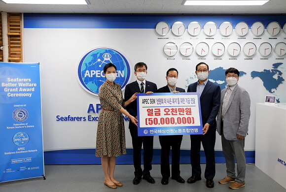 APEC SEN(아시아태평양 경제협력체 선원네트워크) 사무국은 지난 11일 전국해상선원노동조합연맹이 사무국을 방문해 총 5000만원의 선원 복지 기금을 전달했다고 14일 밝혔다.