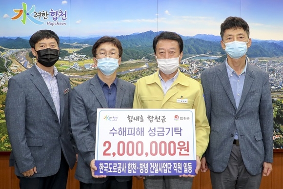 한국도로공사 합천창녕건설사업단이 지난 10일 집중호우 피해로 힘든 시기를 겪고 있는 수해민에 써달라며 합천군에 성금 200만원을 기탁했다.