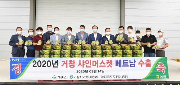 경남 거창군은 14일 서북부경남거점APC에서 구인모 거창군수를 비롯해 거창원예농협조합장, 아림골영농조합 관계자 등 15여명이 참석한 가운데 '거창 샤인머스켓 베트남 수출 선적식'을 갖고 수출물량 10톤 중 1차 선적분 280박스를 베트남으로 수출했다.