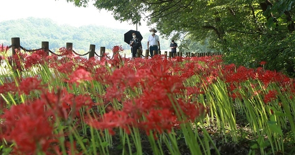 초가을 날씨를 보인 15일 경남 함양군 함양읍 상림공원(천연기념물 제154호)에서 활짝 핀 꽃무릇이 아름다운 자태를 뽐내고 있다. (사진=함양군 제공)