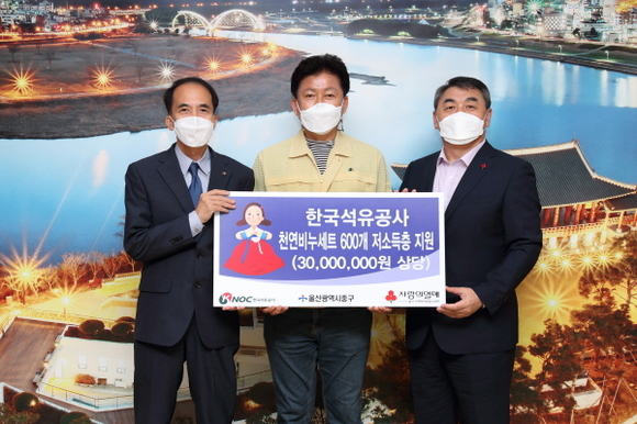 (왼쪽부터) 한국석유공사 남상철 사회적가치추진단장, 박태완 울산 중구청장, 울산사회복지공동모금회 강학봉 사무처장이 전달식에서 기념촬영을 하고 있다. (사진=석유공사 제공)