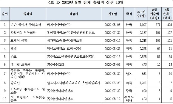 영화진흥위원회는 ‘2020년도 8월 한국 영화산업 결산’을 17일 발표하고 위와 같이 밝혔다.
