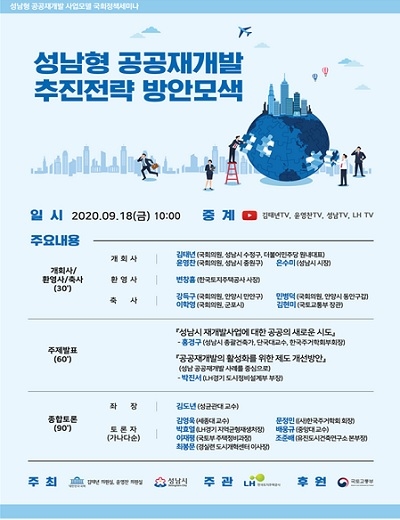 이번 세미나는 지난 20년간 순환이주방식으로 진행했던 성남 원도심 재개발사업의 새로운 발전방향과 함께 공공시행 재개발사업에 대한 제도 개선방안을 모색하기 위해 마련된 자리로, LH 주관 하에 성남시(시장 은수미)와 김태년 의원(더불어민주당 성남 수정구), 윤영찬 의원(더불어민주당, 중원구)이 주최하고, 국토교통부, 강득구 의원(더불어민주당, 안양시 만안구), 민병덕 의원(더불어민주당, 안양시 동안구갑), 이학영 의원(더불어민주당, 군포시)이 후원하는 등 많은 국회의원들이 참여하는 가운데 진행됐다.