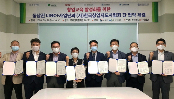 국립 경상대학교(GNU) 사회맞춤형 산학협력 선도대학(LINC+) 육성사업단은 지난 16일 오후 부산 동명대학교 국제산학협력관에서 동남권 7개교 LINC+사업단과 (사)한국창업지도사협회 간의 ‘창업교육 활성화를 위한 상호협약’을 체결했다.