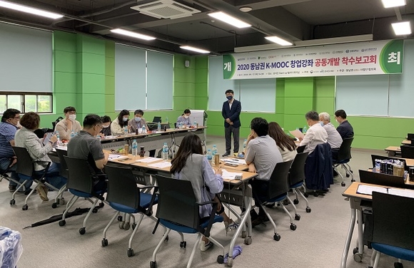 이날 보고회에는 경남대, 경상대, 동명대, 동서대, 동아대, 동의대, 부경대, 울산대, 인제대, 창원대, 한국해양대 등 동남권 11개 대학 LINC+사업단협의회 교수진 및 대학별 실무 관계자 20여명이 참석했다. K-MOOC 스타트업챌린지 창업강좌 제작 오리엔테이션에 이은 질의응답 등으로 진행했다.
