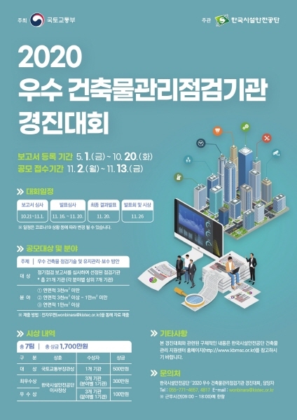 한국시설안전공단은 4차 산업기술을 적용한 혁신적인 건축물관리 점검기술을 발굴하고, 관리·보수방안의 우수사례를 보유한 건축물관리점검기관을 지원하기 위해 ‘2020 우수 건축물관리점검기관 경진대회’를 개최한다.
