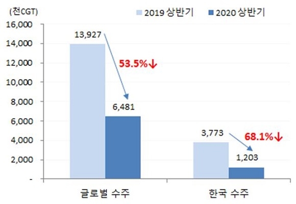 또 조선산업은 상반기 수주가 전년동기대비 68.1% 감소했으며 수주잔량도 전년동기대비 2.6% 감소한 것으로 나타났다. 상반기 국내 조선업 수주 시장점유율은 18.6%로 전년동기대비 8.5%p 감소한 반면 중국은 정부 차원의 선박 투자로 상반기 수주 점유율이 지난해 35%에서 올해 61.4%로 크게 늘었다.