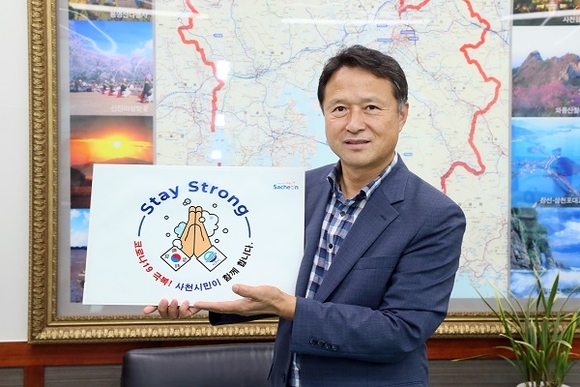 최재원 사천시 부시장은 코로나19 감염사태의 조기종식을 기원하고 시민들에게 희망을 주기 위해 지난 18일 '스테이 스트롱(Stay Strong)' 캠페인에 동참했다.