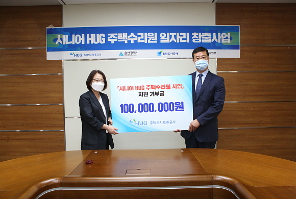 주택도시보증공사(HUG)가 지난 21일 ‘시니어 HUG 주택수리원 일자리 창출 사업’ 추진을 위해 울산시, 한국노인인력개발원 등과 비대면 협약을 맺고 사업비 1억원을 기부했다고 23일 밝혔다.